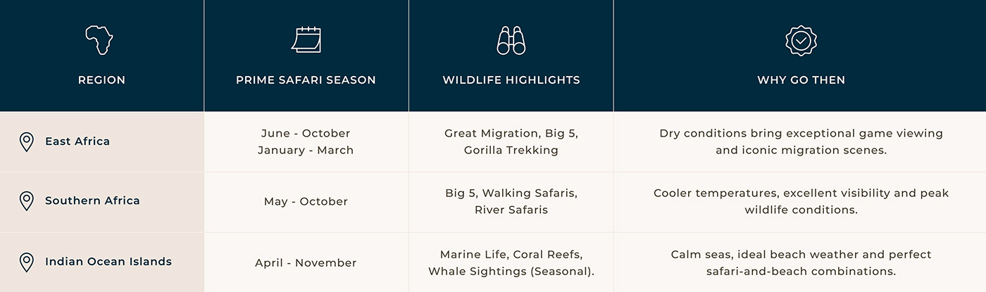 The best time to visit Africa depends on where your journey takes you, and what you want to experience along the way. From iconic wildlife encounters and diverse landscapes to tranquil island escapes, there’s always a perfect moment waiting.