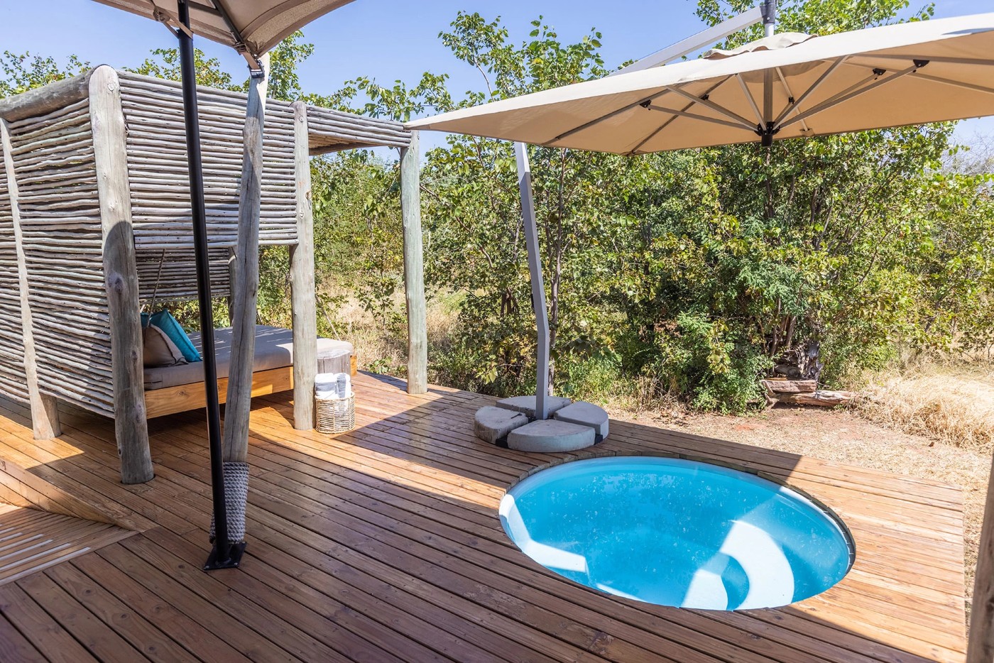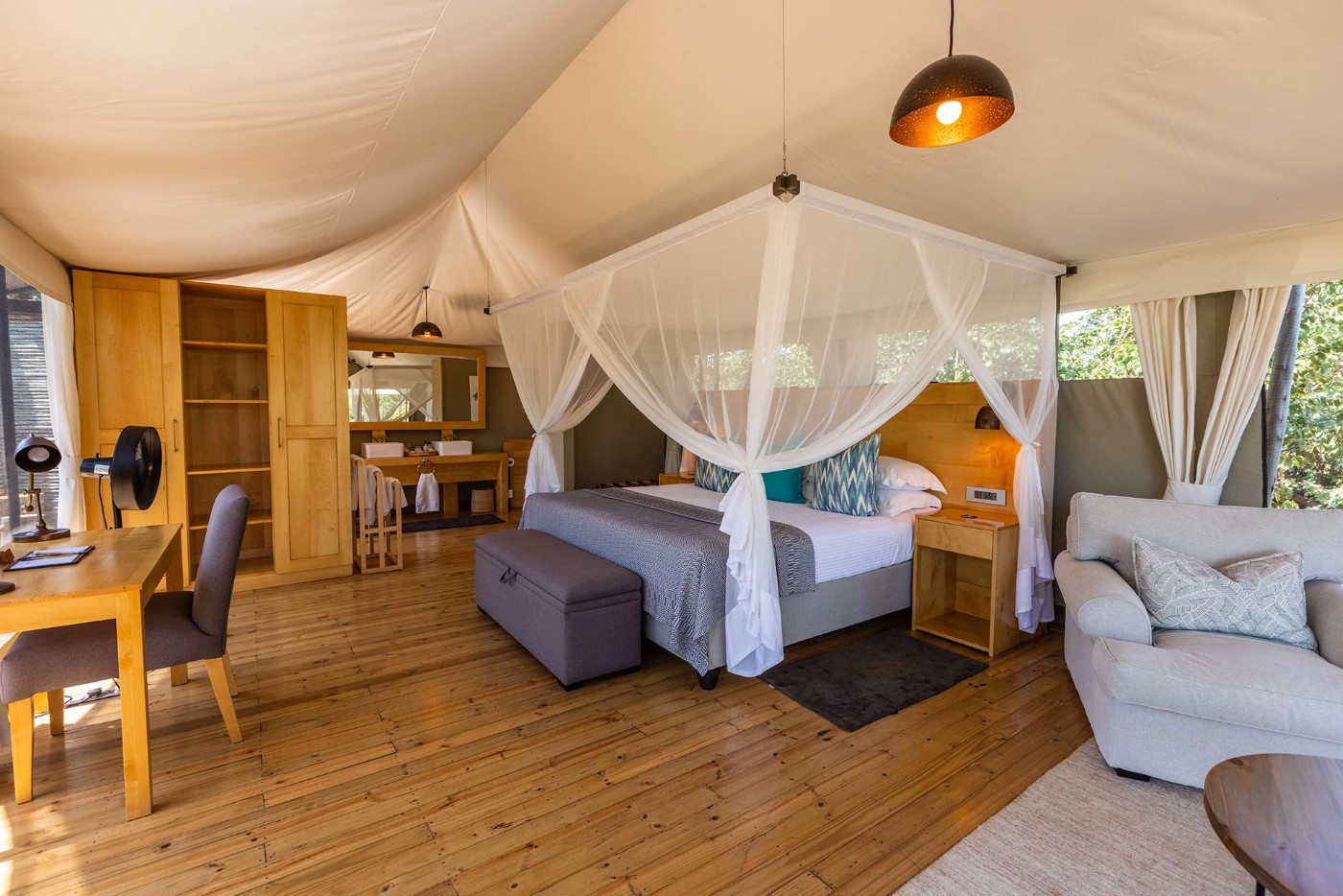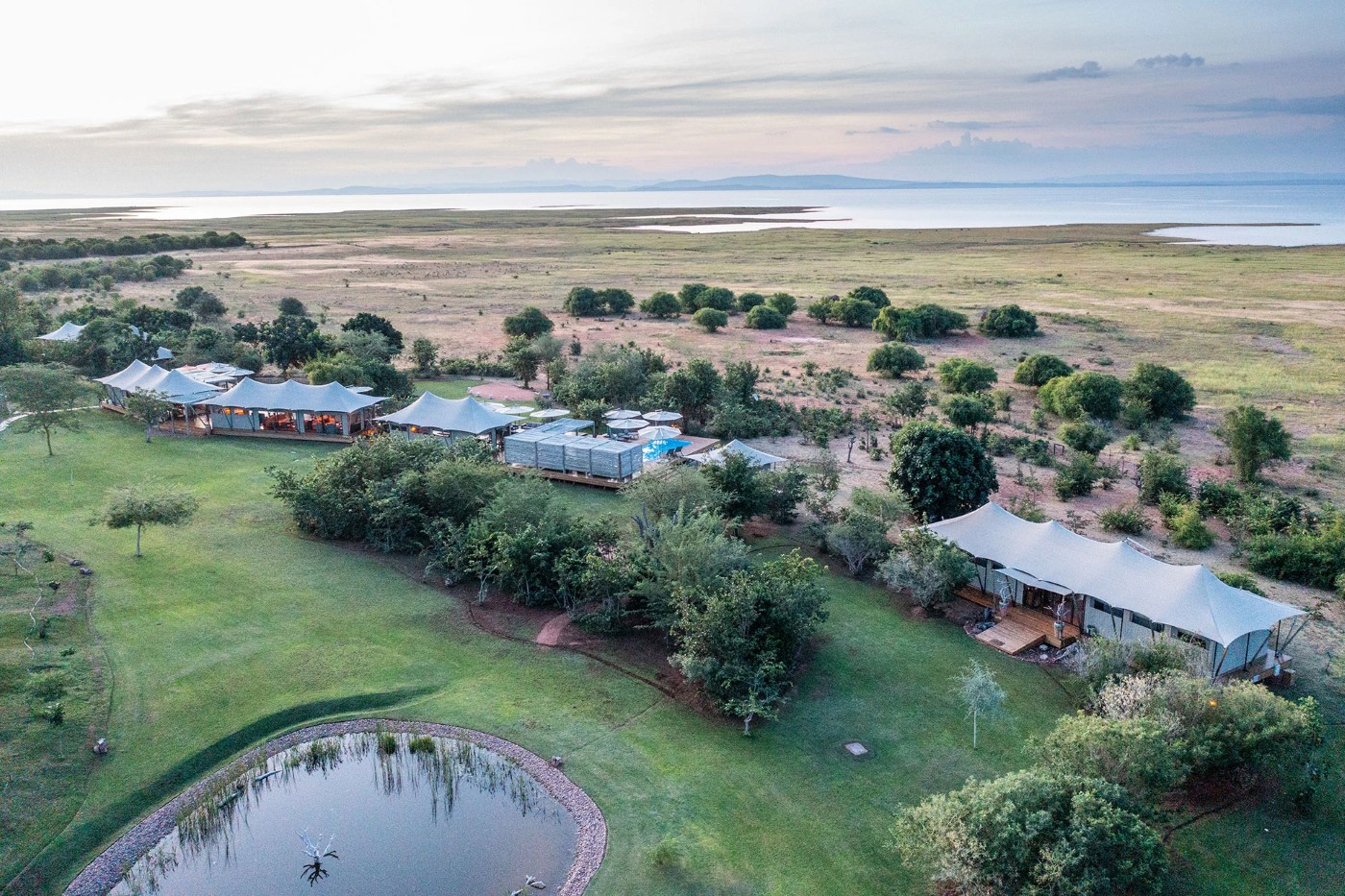 Each of the Suites has a small pool for cooling off. The main area has a larger pool, two separate lounge and dining tents, and a bar area. The whole camp has been protected from elephants and predators by an electric fence, the main purpose of which is for the safety of children as well as to protect the 400+ trees that are planted around the camp.